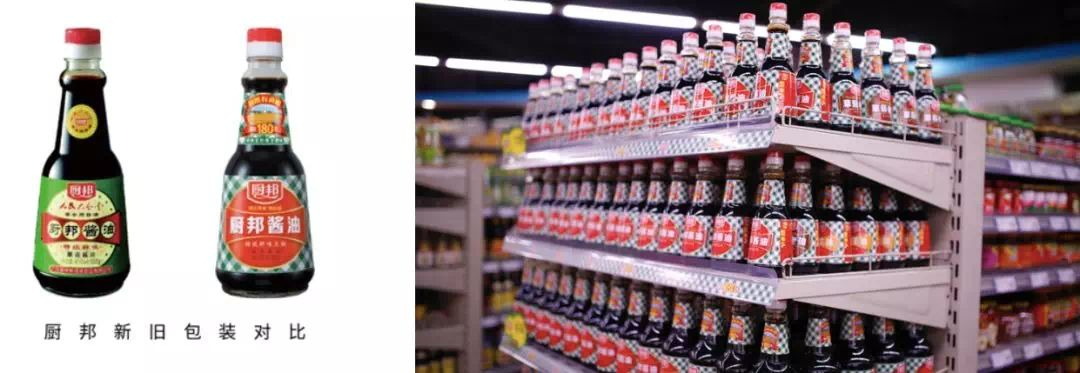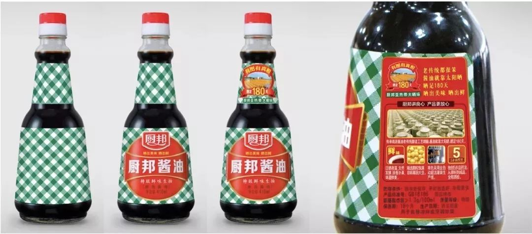 “厨邦”酱油包装设计上,使用的绿格子花边,帮助它获得了巨大的陈列优势。