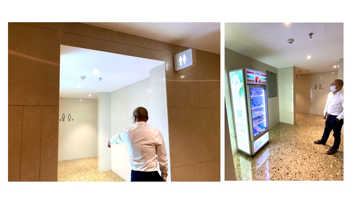 我们去了东莞市中心最高楼民盈国贸商场,据客户说在商场卫生间有投放女性mini无人售货柜,