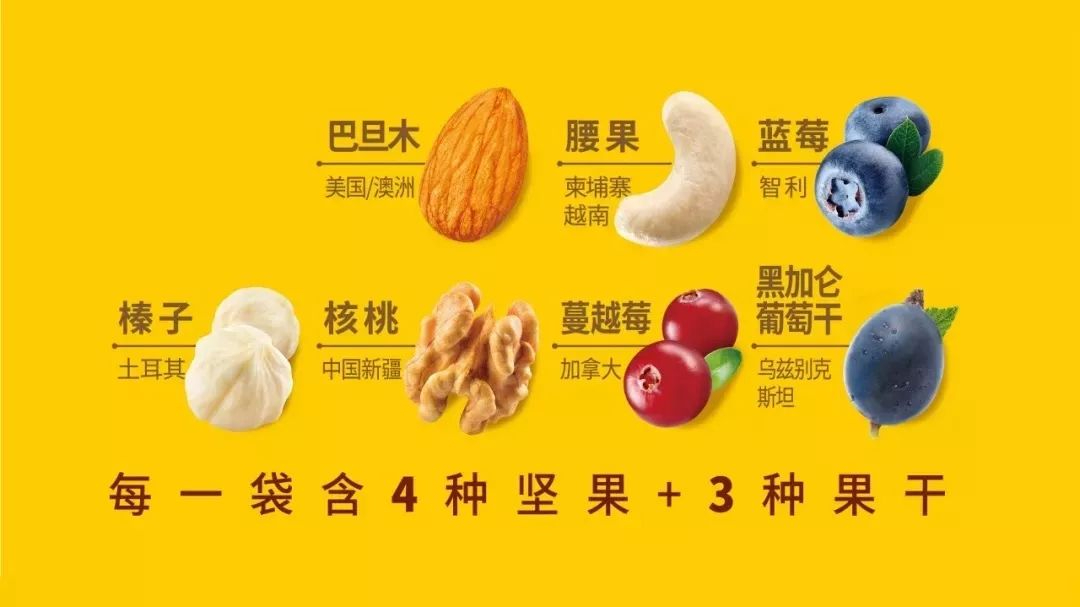 ④清晰写上产品组合信息:“每一袋含4种坚果+3种果干”、侧面开窗,一眼看到多少包,不用解释;
